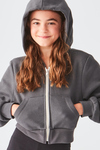 Zip into fun with the Girls Crop Full Zip Fleece Hoodie — cropped length, split pockets, and exposed metal zipper for edgy flair. Perfect for travel warm‑ups, selfies, and neon sleeve art.